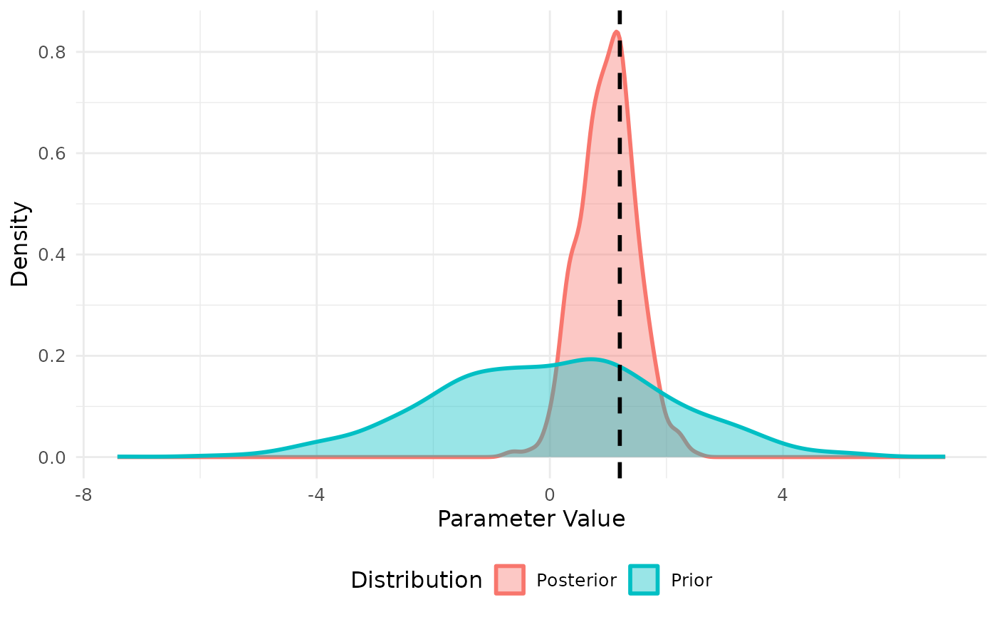 The function uses geom_density() to visualize both prior and posterior samples, and geom_vline() to optionally display the true parameter value. It uses theme_minimal() and places the legend at the bottom for clarity.